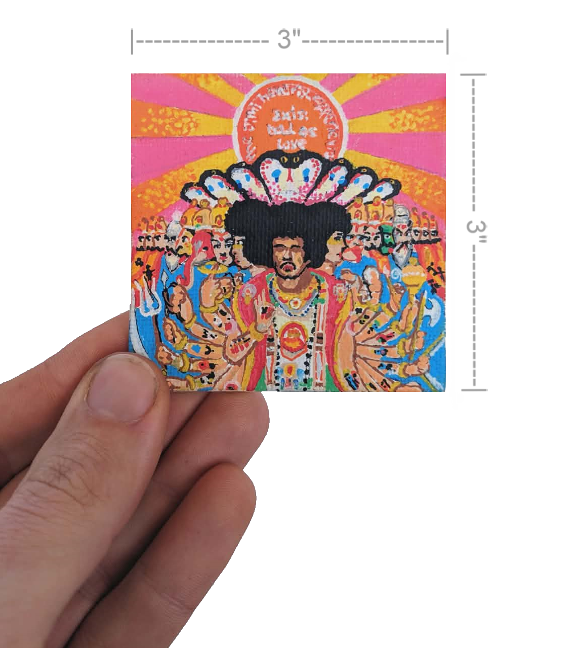 Original paintings are reproduced at 3"×3" as thick, tactile collectibles—not flat art prints. They’re called Mini Albums.